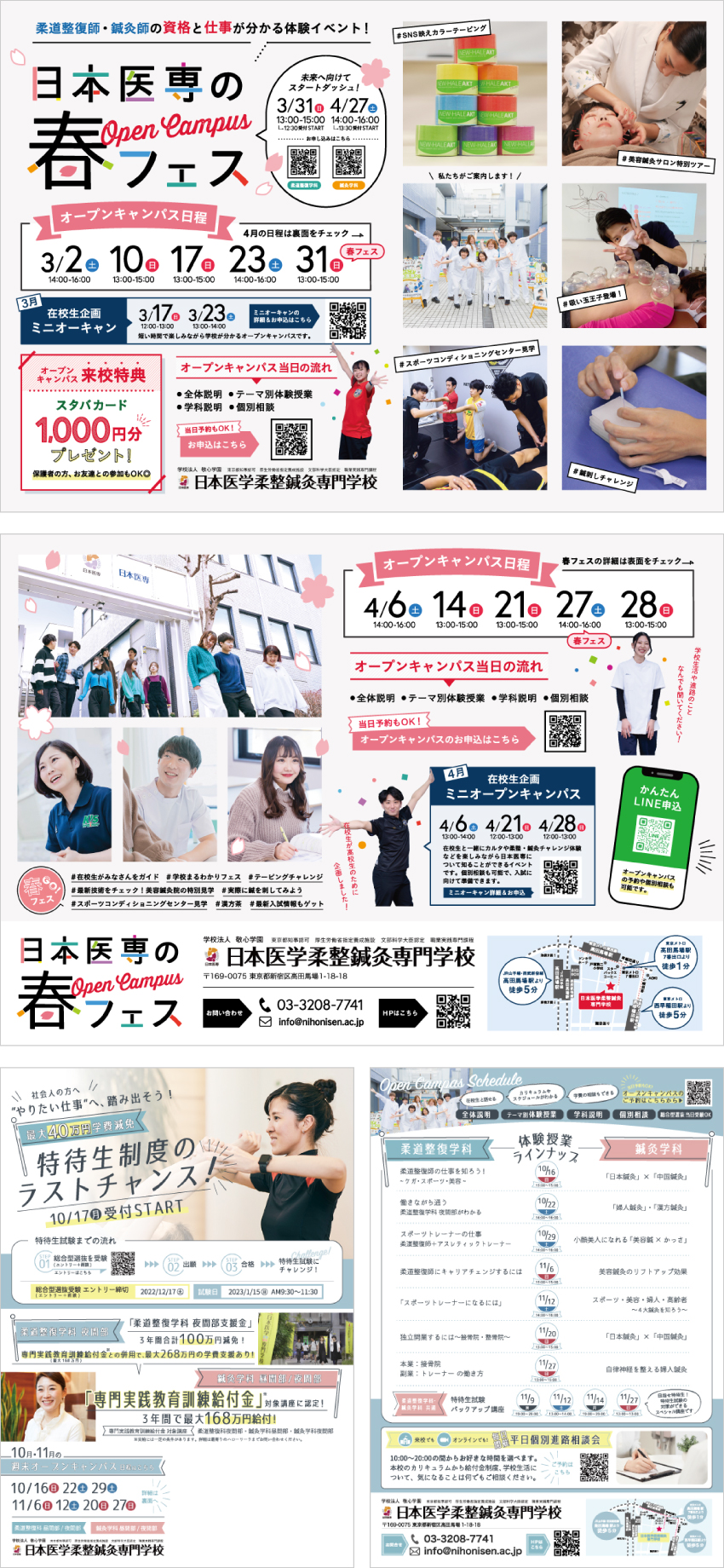 教育 パンフレット・DM 高校生向けのパンフレットとDMをトータルでデザイン。学校の特色や学科ごとの魅力が伝わる企画構成・表紙ビジュアルから紙面デザイン・コピーライティングまで一貫して対応しました。ターゲットに響くトーンで説明会参加へとつなげる導線設計を行っています。 制作物:パンフレット(210mm正方形×8ページ) そのほか、オープンキャンパスを告知するためのDM(ダイレクトメール)も制作いたしました。 制作物:DM(ダイレクトメール/A4) 小売業 POP 前の記事 不動産業 チラシ・POP 次の記事